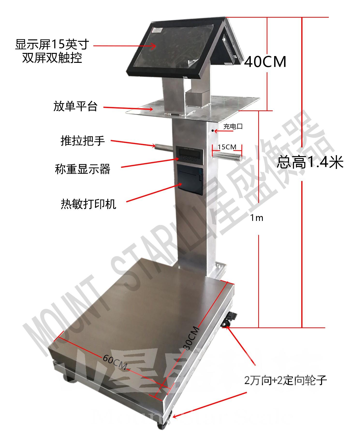 多功能一體電子秤是在電子秤的基礎上加裝多種選配件組裝成,由15寸雙觸膜顯示器+打印機+充存電+攝像頭+掃碼裝置等